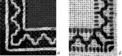 Рис. 4. Часть бордюра рязанской двухслойной поневы а — лицевая сторона, б — изнаночная сторона.На рис. 4 показан фрагмент рязанской узорной двухслойной ткани (бордюр поневы), хранящейся в Государственном Русском музее.