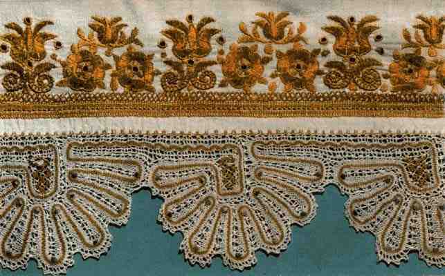 Женская рубашка. Вышивка края рукава гладью и настилом серебряной нитью и шелком по хлопчатобумажной ткани. Конец XIX в. Западно Словацкая область, г Трнава.