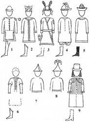 …Костюм музыкантов древнерусских торговых республик в XIII-XV вв., судя по изображениям разных типов, имеет ряд особенностей (рис. 4). Они связаны со статусом этих лиц, с характером развлекательной культуры Новгорода и Пскова, а также в ряде случаев с иностранной модой (монгольской из Золотой Орды и западноевропейской). Даже самые богато одетые музыканты-скоморохи не имеет тех роскошных полихромных одежд со вставками цветных камней византийского облика, которые ранее носили придворные актеры столицы единой Руси – Киева (фрески Софийского собора) (рис. 1). На цветных изображениях в церковных книгах мы обычно видим одежды белого цвета и красную обувь (рис. 2, 1-3), а сами музыканты (в отличие от ранней Киевской Руси) всегда гладко бриты, без бороды и усов. К сожалению, поза музыкантов (особенно – сидящих с гуслями) часто не позволяет выяснить, распашная у них одежда или нет, какова ее длина, есть ли пояс и каков он.